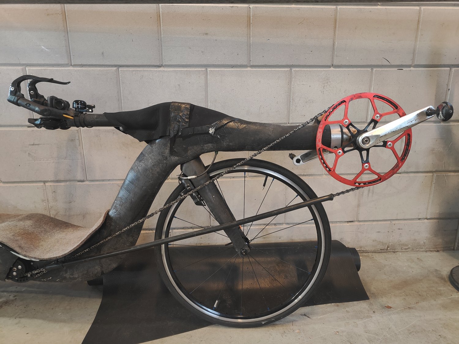 Carbon low racer. Let op de stroomlijn bij het stuur.